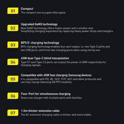 Wspiera technologie szybkiego ładowania Ładowarka wspiera technologie szybkiego ładowania: Quick Charge 4.0 / 3.0, Power Delivery 3.0, Huawei Super Charge, FCP AFC, MTK. Oznacza to, że baterię np. telefonie Samsung ładuje w 30 minut do poziomu 60%. Jest kompatybilny m.in. z urządzeniami iPhone 11, Huawei Mate 30, Samsung S20, Xiaomi Mi 10, tabletami i laptopami Apple. Najnowsze technologie – BPS II (ładowanie), BCT (chłodzenie) Innowacyjna technologia chłodzenia BCT oraz szybkie ładowanie BPS II to funkcje, jakie użytkownikom ładowarki oferuje jej producent. Chociaż moc ładowania jest bardzo duża, a czas procesu skrócony do minimum, nie istnieje ryzyko przegrzania czy uszkodzenia sprzętu. Bezpieczeństwo na wysokim poziomie Baseus wdrożył aż 6 różnych zabezpieczeń, których celem objęcie ładowarki i urządzenia obsługiwanego ochroną: