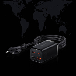 Baseus GaN3 Pro szybka ładowarka sieciowa GaN 2 x USB Typ C / 2 x USB 65W PD, QC4.0+, AFC + kabel USB Typ C - USB Typ C 1m czarny (CCGP040101) Trudno wyobrazić sobie obsługiwanie sprzętów elektronicznych bez pomocy ładowarek. Każdy, kto chce skrócić proces ładowania baterii, uczynić go bardziej efektywnym, a zarazem energooszczędny powinien zainteresować się gadżetami nowej generacji. Baseus GaN3 Pro to absolutny hit na rynku, który ma realną szansę na jego zrewolucjonizowanie. Dlaczego? Ponieważ zamiast krzemu wykorzystuje moc płynącą z azotku galu. GaN jest półprzewodnikowym materiałem, który nie tylko poprawia efektywność procesu ładowania, ale też potrzebuje znacznie mniej energii i zajmuje minimalną ilość miejsca. Dlatego jest idealny do zastosowania mobilnego, również w pracy czy w podróży po całym świecie. Jest kompatybilna z gniazdkami na całym świecie, w których standardy napięć elektryczny wahają się od 100 do 240 V. Specyfikacja: