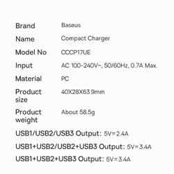 - Prąd wyjściowy 3x USB typu A: 5V/3.4A (17W)