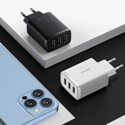 Ładowarka od Baseus pozwoli Ci zrezygnować z noszenia ze sobą dwóch ładowarek. Wszystko za sprawą specjalnego projektu. W górnej części wtyczki znajdują się trzy wejścia USB. Dzięki temu rozwiązaniu, możesz zrezygnować z trzech osobnych ładowarek i zastąpić ją jedną, co jest zdecydowanie praktyczniejsze i zajmuje mniej miejsca w torebce czy plecaku. Dodatkową zaletą tego rozwiązania jest możliwość ładowania trzech urządzeń jednocześnie, zajmując wyłącznie jedno gniazdko.