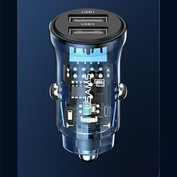 USAMS Przezroczysta podwójna ładowarka samochodowa USB A + A Mini Przezroczysty mechaniczny design idealnie ukazuje detale precyzyjnych komponentów tego urządzenia. Wspiera dwa niezależne porty szybkiego ładowania jednocześnie, oszczędzając cenny czas. Dwa porty łącznie do 3A gwarantują szybkie ładowanie. Porty USB są kompatybilne z protokołami fast charge takimi jak QC/AFC/SCP/FCP/Apple2.4 wspierając szybkie ładowanie dla modeli Huawei, Apple, Xiaomi, Honor, OPPO, Samsung, itd. Bezpieczeństwo zapewnia specjalny czip, który kontroluje temperaturę chroniąc przed zwarciem, wysokim napięciem, przegrzaniem itp. Ładowarka posiada ciepłe lampy LED, które zapalają się w momencie podłączenia. Dane Techniczne
