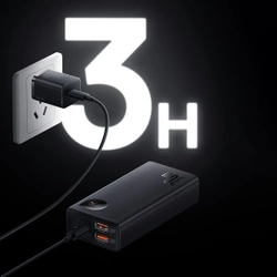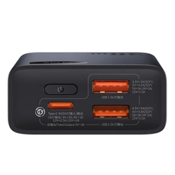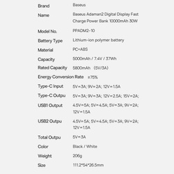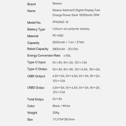 powerbank o pojemności 10000 mAh marki Baseus. Obsługuje prąd wyjściowy o maksymalnej mocy 30W. Obsługuje wiele standardów szybkiego ładowania m.in. SCP, Quick Charge 3.0, Power Delivery 3.0. Ma wbudowane 2 wyjściowe porty USB oraz port wejściowo-wyjściowy USB Typ C (do ładowania telefonów i samego powerbanku) Ekran LED, który znajduje się na jego obudowie wskazuje poziom naładowania akumulatorów. Układ scalony obsługuje wiele zabezpieczeń, które chronią podłączone urządzenia przed uszkodzeniem.