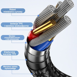 Kabel USAMS US-SJ580 U82 Nowoczesny kabel US-SJ580 firmy USAMS to innowacyjny produkt cechujący się niezwykle szybką transmisją danych i nowoczesnym wzornictwem. Przewód z serii U82 to innowacyjny produkt, zapewniający nie tylko doskonałe parametry pracy, lecz również stylowy wygląd. Przewód został wykonany z wielożyłowego splotu miedzianych żył które gwarantują większą stabilność przewodzenia prądu i stabilniejsze ładowanie. Kabl został zabezpieczony warstwą TPE, aluminium oraz oplotu z nylonu co sprawia, iż jest on niezwykle trwały. Kabel działa w oparciu o inteligentny chip E-Marker, który jest kontrolerem dopasowującym odpowiednie parametry zasilania do urządzenia. Za pomocą tego przewodu możesz ładować nie tylko smartfony, lecz również laptopy, tablety czy konsole do gier, natomiast duża moc kabla zapewnia szybkie ładowanie laptopów - bateria MacBook'a Pro naładuje się do poziomu 56% w przeciągu tylko 30 minut! Przewód jest kompatybilny z technologią Fast Charging i PD (Power Delivery) - zapewnia szybkie ładowanie urządzenia bez uszkodzenia jego baterii. Duża moc 240W i wysokie natężenie prądu sprawia, iż kabel użyty z ładowarką kompatybilną z technologią szybkiego ładowania pozwala na naładowanie baterii smartfona w niezwykle krótkim czasie. Kabel obsługuje protokoły szybkiego ładowania telefonów takich marek takich jak Huawei, Xiaomi, Samsung czy Apple. Kabel pozwala na transmisję danych z prędkością do 480 Mbps- przesłanie pliku o rozmiarze 1GB trwa tylko 30 sekund.