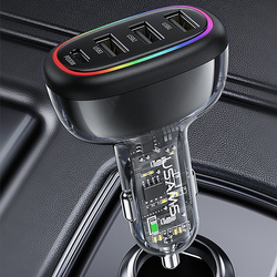 Ładowarka samochodowa USAMS US-CC170 Przeźroczysty mechaniczny design idealnie ukazuje detale precyzyjnych komponentów tego urządzenia. Ładowarka posiada ciepłe lampy RGB, które zapalają się w momencie kiedy zapada ciemność. Miękkie światło lampki jest bardzo delikatne i praktytczne, kiedy prowadzisz swój samochód nocą- nie musisz się martwić, że coś Cię będzie rozpraszało czy Cię oślepi. Urządzenie wyposażono w cztery porty USB, z czego port USB-C zawsze umożlwia szybkie ładowanie i jest kompatybilne z takimi protokołami jak PPS/PD3.0/PD2.0. Trzy porty USB pozwalają na ładowanie kilku urządzeń jednocześnie, a Ty oszczędzasz swój cenny czas. Ładowarka samochodowa posiada wbudowany inteligentny chip, który zabezpiecza urządzenia przed nadmiernym przeładowaniem- automatyczni uruchamia się w tryb podtrzymywania w chwili, kiedy Twoje ładujące się urządzenie jest naładowane do poziomu 80%. Uwaga! Produkt jest przeznaczony tylko dla większości samochodów z zapalniczką samochodową i wejściem o napięciu 12V-24V, nie jest dostosowany do ciężarówek, koparek i innych pojazdów z napięciem wyższym niż 24V.
