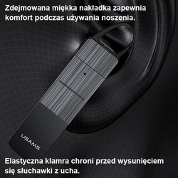Słuchawka Bluetooth USAMS-BT BT2 Niezwykle wygodna i stylowa słuchawka bezprzewodowa Bluetooth która umożliwi Ci obsługę zdalną Twojego telefonu zawsze, kiedy tego Ci potrzeba- nieważne czy jesteś w drodze czy w pracy. Urządzenie jest idealne dla osób poszukujących lekkiej, perfekcyjnie dopasowanej słuchawki. Zdejmowana, miękka nakładka swobodnie obraca się i dostosowuje się do kształtu kanału słuchowego. Bezpieczeństwo urządzenia jest gwarantowany przez bardzo stabilny zaczep na ucho. Inteligentny chip BT 5.0 gwarantuje Ci szybkie połączenie słuchawki z telefonem i długi czas czuwania urządzenia- aż do 50 godzin. Nowocesny chip automatycznie paruje urządzenie z Twoim telefonem- akcesorium będzie współpracowało z smartfonem nawet w odległości kilku metrów od telefonu. Słuchawka została zaprojektowana do jak najlepszej redukcji szumów i obsługi głosowej. Do sterowania wykorzystujemy tylko jeden przycisk- nie potrzebujesz już telefonu gdyż różne funkcje przełącza się jednym dotknięciem. Mikrofon zapewnia krystalicznie czyste rozmowy HD i obsługuje połączenia trójstronne dzięki zastosowaniu zaawansowanej technologii.