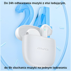 AWEI Słuchawki Bluetooth 5.3 T26 Pro TWS AWEI T26 Pro TWS to ergonomiczne, wodoodporne słuchawki bezprzewodowe ze stacją ładowania. Kompaktowa konstrukcja słuchawek jest pełna zaawansowanej technologii takiej jak re-dukcja hałasu czy możliwość sterowania za pomocą dotyku. Dzięki wbudowanemu dotykowemu panelowi, rozmiar i waga słuchawek zostały znacznie zreduko-wane, a Ty możesz w wygodny sposób sterować nimi za pomocą dotyku. Bluetooth 5.3 umożliwi płynne podłączenie do smartfonu, gwarantując stabilną i wydajną transmisję dźwięku. Dzięki doskonałym nanomateriałom słuchawki posiadają ochronę wodoodporności na po-ziomie IPX4. Od teraz nie musisz się martwić deszczem i potem podczas użytkowania.