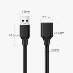 Ugreen kabel przedłużacz USB (męski) - USB (żeński) 2.0 480Mb/s 3m czarny (US103) Przedłużacz marki Ugreen pozwala przesyłać dane z szybkością do 480Mb/s. Jest wykonany w technologii USB 2.0 i posiada wtyczki USB (męski) i USB (żeński). Jest kompatybilny wstecz z technologią USB 1.0. Za jego pomocą szybko skopiujesz dane ze sprzętów elektronicznych ze złączem USB-A. Można go też użyć do podłączenia urządzeń peryferyjnych, które znajdują się daleko od komputera. Przedłużacz pozwala łatwo podłączyć się do trudno dostępnego portu USB, które znajduje się np. z tyłu obudowy komputera. Rozwiąże też problem ze zbyt krótkim kablem przy niektórych urządzeniach. Bardzo przydatny w codziennej pracy biurowej. Specyfikacja: