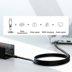 Przejdź na rozwiązanie, dzięki któremu jednocześnie naładujesz 2 urządzenia, prześlesz obraz z komputera na duży ekran oraz skorzystasz z plików na Twoim pendrive! Uniwersalna szybka ładowarka od Baseus będzie w stanie naładować Twoje sprzęty w bardzo krótkim czasie, co czyni ją idealnym wyborem podczas pracy w biurze lub w domu. Łączna moc ładowarki wynosi aż 67W. Dzięki zastosowanej technologii GaN5 ładowarka posiada względnie nieduże rozmiary i zwiększoną efektywność względem klasycznych ładowarek. Ładowarka może z powodzeniem służyć jako HUB USB - pozwala na transfer danych, podłączenie urządzeń peryferyjnych tj. klawiatury i myszki bezprzewodowej oraz przesyłanie (kopiowanie) obrazu w rozdzielczości 4K 30Hz dzięki zastosowaniu portu USB4. Producent wyposażył ładowarkę w 1,5m kabel zasilający oraz kabel USB-C - USB-C w standardzie USB4 o długości 1m.