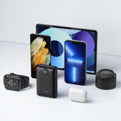 Power bank Veger S20 o pojemności 20 000 mAH to gwarancja szybkiego ładowania w dowolnym miejscu i czasie. Wygodne ładowanie Zastosowanie cenionej na rynku baterii litowo-polimerowej gwarantuje wolniejsze rozładowywanie się power banka. Pojemność na poziomie 20 000 mAh pozwoli Ci kilkukrotnie uzupełnić energię w telefonie, tak że przyda się w trasie, kiedy nie ma stałego dostępu do gniazdek elektrycznych. Kilka urządzeń jednocześnienie 5 portów, w tym micro USB, 2x USB-C i 2x USB, obsługuje technologie szybkiego ładowania Power Delivery (22,5W) i Quick Charge 3.0, a do tego umożliwią naładowanie w tym samym czasie trzech urządzeń, np. smartfona, tablet, podręczną konsolę czy słuchawki typu TWS. Dzięki USB-C bez problemu podłączysz najnowszy sprzęt na rynku. Zabieraj go wszędzie, gdzie potrzebujesz Minimalistyczna, smukła konstrukcja oraz niewielka waga sprawiają, że power bank nadaje się do użycia w trakcie podróży, a wyświetlacz LED poinformuje Cię o poziomie naładowania urządzenia. Specyfikacja: Pojemność: 20 000 mAh Napięcie baterii: 3,85V Maksymalne napięcie: 5V/2A Moc: 22,5W Materiał: Plastik Porty: 2x USB, 2x USB-C, micro USB Waga: 302 g Kolor: Czarny Obsługuje technologie szybkiego ładowania Power Delivery (22,5W) i Quick Charge 3.0