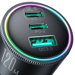 Moc i wydajność ładowaniaJoyroom JR-CCN07 z 120W mocy wyjściowej gwarantuje, że Twoje urządzenia zawsze będą gotowe do działania. Dzięki wsparciu dla różnych protokołów szybkiego ładowania zapewnia optymalną efektywność i skraca czas potrzebny do pełnego naładowania baterii. Komfort użytkowania po zmrokuKolorowy pierścień LED nie tylko dodaje stylu, ale również praktyczności. Umożliwia łatwe odnalezienie portów ładowania w nocy, eliminując konieczność szukania ich w ciemności i zwiększając komfort użytkowania. Wielofunkcyjność portówDwa porty USB-C z Power Delivery i jeden port USB-A z Quick Charge 3.0 gwarantują, że każde z Twoich urządzeń zostanie naładowane w optymalny sposób. Bez względu na to, czy to smartfon, tablet, czy laptop - każde z nich zyska energię w ekspresowym tempie. Uniwersalność i kompatybilnośćŁadowarka jest kompatybilna z wieloma protokołami szybkiego ładowania, co sprawia, że jest niezwykle uniwersalna. Możesz mieć pewność, że bez względu na model i markę Twojego urządzenia Joyroom JR-CCN07 zapewni mu najwyższą efektywność ładowania. Elegancja i stylCiemnoszary kolor i nowoczesny design ładowarki Joyroom JR-CCN07 sprawiają, że jest nie tylko wydajnym urządzeniem, ale również eleganckim elementem wyposażenia Twojego samochodu.