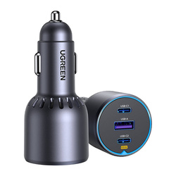 Ładowarka samochodowa Ugreen EC703, USB + 2x USB-C, 75W (czarna)Ugreen EC703 to wieloportowa ładowarka samochodowa, która zapewni Ci niezrównaną wydajność ładowania w podróży. Dzięki potrójnym portom ładowania – dwóm portom USB-C i jednemu portowi USB-A – możesz ładować jednocześnie trzy urządzenia z maksymalną mocą do aż 75 W. Solidna konstrukcja stabilnie utrzymuje ładowarkę w gnieździe zapalniczki, niezależnie od warunków na drodze.
