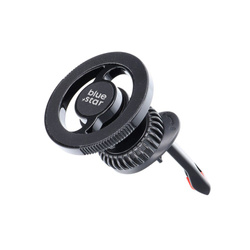 BLUE STAR SMART LOCK X1 to magnetyczny uchwyt samochodowy, który zapewnia wygodne i bezpieczne mocowanie smartfona do kratki wlotu powietrza w pojeździe. Kompatybilny z technologią MagSafe, uchwyt jest idealnym rozwiązaniem dla użytkowników iPhone'ów z serii 12 lub nowszych oraz etui wspierających magnetyczne mocowanie. Zaletą uchwytu jest jego obrotowa konstrukcja, która pozwala na łatwą regulację kąta widzenia urządzenia o 360 stopni. Posiada również blokadę mechanizmu obrotu. Silny magnes wbudowany w uchwyt zapewnia, że smartfon pozostanie na miejscu nawet podczas dynamicznej jazdy, eliminując obawy o przypadkowe zsuwanie się czy upadki urządzenia. Innowacyjny design oraz łatwość montażu sprawiają, że uchwyt jest nie tylko praktyczny, ale i stylowy dodatek do wnętrza każdego samochodu. Dzięki kompaktowej formie i solidnej konstrukcji, uchwyt jest zarówno trwały, jak i dyskretny. Instalacja uchwytu jest szybka i intuicyjna – wystarczy zamocować go do kratki wlotu powietrza i przyłożyć do niego urządzenie lub etui wspierające MagSafe. Dzięki dołączonym dwóm metalowym okręgom można używać uchwytu również ze smarfonami nie wspierającymi magnetycznego mocowania. Specyfikacja: