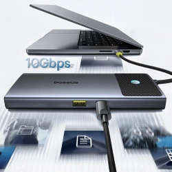 Rozszerzenie obrazu na wielu ekranachJeśli potrzebujesz efektywniejszej pracy na wielu monitorach, HUB Baseus Metal Gleam Series II 7w1 to idealne rozwiązanie. Dzięki obsłudze podwójnego wyświetlacza 4K na macOS możesz jednocześnie korzystać z trzech ekranów, co znacząco zwiększa produktywność. Jeden port HDMI obsługuje 4K 60 Hz, co zapewnia płynność obrazu, a drugi port 4K 30 Hz, co jest idealne dla dodatkowych aplikacji. Aby korzystać z tej funkcji, wystarczy pobrać kompatybilny sterownik SiliconMotion. Link do pobrania: tutaj. ![]() Błyskawiczne przenoszenie plikówDzięki prędkości transferu danych do 10 Gbps HUB Baseus Metal Gleam Series II 7w1 umożliwia przenoszenie dużych plików w mgnieniu oka. Teraz przesłanie 20 GB danych zajmuje tylko 20 sekund, co pozwala oszczędzić cenny czas podczas pracy nad dużymi projektami. Niezależnie od tego, czy przenosisz pliki graficzne, wideo czy dokumenty, prędkość tego urządzenia zapewni Ci najwyższą wydajność. ![]() Ekspresowe ładowanie laptopaNie musisz już czekać godzinami na naładowanie swojego laptopa. HUB Baseus Metal Gleam Series II 7w1 zapewnia szybkie ładowanie, które pozwala na pełne naładowanie MacBooka Pro w zaledwie 2 godziny, a MacBooka Air w 2,5 godziny. Aby osiągnąć optymalne wyniki, zaleca się użycie adaptera PD 100W i kabla PD. Teraz możesz szybko wrócić do pracy bez długich przerw na ładowanie. ![]() Szybkie blokowanie ekranu dla większego bezpieczeństwaZadbaj o swoją prywatność z HUB Baseus Metal Gleam Series II 7w1, który umożliwia szybkie blokowanie ekranu. Dzięki prostemu mechanizmowi podwójnego naciśnięcia przycisku dla macOS lub jednego dla Windows możesz natychmiast zablokować swój ekran i chronić swoje dane przed niepowołanymi osobami. To szybkie i efektywne rozwiązanie dla każdej sytuacji wymagającej natychmiastowej ochrony. ![]() Wszechstronna kompatybilność z różnymi urządzeniamiHUB Baseus Metal Gleam Series II 7w1 oferuje szeroką kompatybilność z różnymi modelami laptopów. Niezależnie od tego, czy używasz MacBooka Air lub Pro z procesorem M1, M2 lub M3, HP Spectre x360, MateBooka, DELL XPS, czy Microsoft Surface, ten hub działa bez zarzutu. Dzięki temu możesz cieszyć się wszystkimi jego funkcjami na różnych urządzeniach, co czyni go niezwykle uniwersalnym i praktycznym narzędziem. ![]()