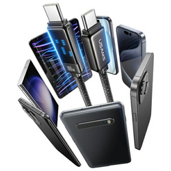Kabel szybkiego ładowania i przesyłu danych 100W. Kabel w nylonowym oplocie charakteryzuje się wbudowanym wyświetlaczem LED METEOR. Posiada wtyczki typu USB-C/USB-C. Przewód ma wysoką odporność na zginanie. Prędkość przesyłu danych 480 Mbps. Wyposażony w inteligentny Chip E-marker inteligentnie dostosowujący podawany prąd dla każdego urządzenia. Obsługuje szybkie ładowanie dla całej serii iPhone 15, wsteczna kompatybilność z szybkim ładowaniem 45W/36W/27W/15W.