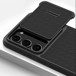 Pancerne etui Samsung Galaxy S23+ z serii Nillkin Textured S Case z osłoną na aparat Etui Nillkin Textured S Case powstało z wysokiej jakości materiałów. Nietypowy tylny panel pokrowca ma przyjemną w dotyku powłokę z włókna nylonowego. Nie tylko zapewnia ona ciekawe wykończenie i ciekawy design, lecz przy tym jest wygodna i zapobiega wyślizgnięciu urządzenia z dłoni. Pokrowiec jest dopasowany do Samsung Galaxy S23+, doskonale chroni go przed zniszczeniami wskutek upadków lub zarysowań (na przykład przez noszone w kieszeni klucze). Pokrowiec posiada przesuwaną osłonę na tylny aparat. Dzięki niej szkło kamery jest chronione przed porysowaniem. Jest do też dodatkowy plus dla osób ceniących prywatność i bezpieczeństwo swoich danych. Zakryta kamera uniemożliwia dostęp do nagrywania obrazu w przypadku kiedy ktoś uzyska zdalny dostęp do telefonu i włączy podgląd z głównej kamery. Podniesione krawędzie dookoła ekranu zabezpieczają go od zarysowania kiedy ten leży na płaskiej powierzchni. Specyfikacja: