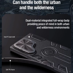 Ochrona, która liczy się podwójnieEtui Nillkin CamShield Armor Prop nie tylko zapewnia bezpieczeństwo Twojego aparatu przed zarysowaniami, ale również chroni Twoją prywatność. Dzięki specjalnej osłonie możesz czuć się spokojnie o bezpieczeństwo danych. To rozwiązanie idealne dla osób ceniących sobie dyskrecję i bezpieczeństwo swojego urządzenia. Podstawka gotowa w każdym momencieOsłona na aparat to wyjątkowa funkcjonalność etui Nillkin CamShield Armor Prop - w mgnieniu oka może zmienić się w wbudowaną podstawkę. Po rozłożeniu umożliwi wygodne korzystanie z telefonu bez konieczności używania rąk. Idealna do przeglądania internetu czy oglądania filmów! Łatwy montaż, niezawodna ochronaPołączenie twardego tworzywa PC z miękką ramką TPU sprawia, że etui Nillkin CamShield Armor Prop jest nie tylko łatwe w montażu, ale również skutecznie chroni telefon przed uszkodzeniami. Niezawodna chwytnośćChropowata powierzchnia etui Nillkin CamShield Armor Prop zapobiega przypadkowemu wyślizgnięciu się telefonu z dłoni. To wygoda, która idzie w parze z ochroną. Dostęp do każdej funkcjiDzięki precyzyjnym wycięciom etui Nillkin CamShield Armor Prop zapewnia łatwy dostęp do wszystkich złączy, mikrofonu i głośników telefonu.