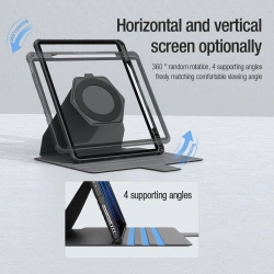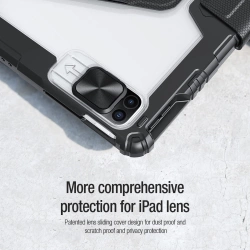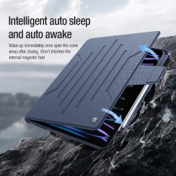 Etui Nillkin Bumper SnapSafe na iPad Pro 12.9 2020/2021/2022 - niebieskieSeria Bumper SnapSafe łączy w sobie styl, funkcjonalność i wygodę. To multifunkcjonalne etui na tablet oferuje większą elastyczność i ochronę, dzięki czemu praca, nauka czy rozrywka będą jeszcze bardziej komfortowe. Możliwość obrócenia tabletu o 360 stopni oraz wyboru jednego z 4 kątów nachylenia sprawia, że możesz dostosować ustawienie tabletu do swoich potrzeb. Wbudowany mocny magnes N42M trzyma tablet stabilnie, a także pozwala na zawieszenie go na ścianie czy lodówce. Osłonka na aparat chroni soczewki przed kurzem i zapewnia prywatność, a funkcja auto-sleep sprawia, że tablet szybko wybudza się i przechodzi w stan uśpienia. Najważniejsze zalety etui Nillkin Bumper SnapSafe na iPad Pro 12.9 2020/2021/2022: