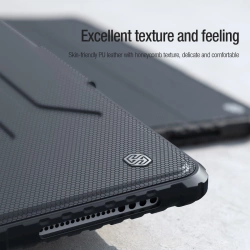 Elastyczność i ochrona etui Nillkin Bumper SnapSafe na wysokim poziomieEtui Nillkin Bumper SnapSafe zapewnia niezrównaną elastyczność i ochronę dla Twojego tabletu. Wykonany z myślą o bezpieczeństwie case łączy w sobie najnowsze technologie i materiały, które gwarantują ochronę przed skutkami upadków, zarysowaniami i innymi uszkodzeniami. Jego unikalna konstrukcja pozwala na łatwe dostosowanie pozycji tabletu, co zwiększa komfort użytkowania w różnych sytuacjach. Magnetyczna funkcjonalność dla Twojej wygodyNillkin Bumper SnapSafe posiada wbudowany magnes N42M. Dzięki niemu możesz nie tylko stabilnie trzymać tablet w dłoni, ale także zawiesić go na dowolnej metalowej powierzchni. To idealne rozwiązanie, gdy potrzebujesz mieć wolne ręce, na przykład podczas gotowania lub pracy. Podwójna ochrona dla podwójnego spokojuKombinacja elastycznego TPU i mocnego PC, dodatkowo wzmocniona powłoką z skóry PU, sprawia, że etui Nillkin Bumper SnapSafe oferuje podwójną ochronę dla Twojego tabletu. Ochrona ta nie ogranicza się tylko do zewnętrznych uszkodzeń mechanicznych, ale również zabezpiecza przed kurzem i zarysowaniami. Elegancki wzór w plastry miodu na zewnętrznej warstwie nie tylko dodaje urządzeniu wyjątkowego wyglądu, ale również zapewnia dodatkową warstwę ochronną. Bezproblemowa ochrona soczewekOsłonka na aparat, wbudowana w etui Nillkin Bumper SnapSafe, chroni soczewki aparatu tabletu przed kurzem i zarysowaniami. Dodatkowo zapewnia ochronę prywatności, uniemożliwiając niepożądane zapisywanie obrazu przez aparat. Funkcja auto-sleep dla oszczędności energiiDzięki inteligentnej funkcji auto-sleep etui Nillkin Bumper SnapSafe znacząco wydłuża czas pracy Twojego tabletu, automatycznie wybudzając go i przełączając w stan uśpienia. To nie tylko wygoda, ale także oszczędność energii.