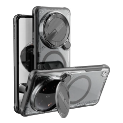 Etui Nillkin Iceblade Prop na Xiaomi 14 Mi Ultra z modułem magnetycznym - czarnePółprzezroczysta konstrukcja etui Nillkin Iceblade Prop z metalowymi, liniowymi i błyszczącymi elementami nada Twojemu smartfonowi nowoczesny wygląd. Innowacyjna osłona na obiektyw z metalu nie tylko chroni aparat, ale także dba o Twoją prywatność. Wbudowany stojak umożliwia wygodne oglądanie ekranu pod różnymi kątami, a system MagSafe z magnetycznym zaczepem zapewnia łatwe i szybkie mocowanie. Połączenie materiałów TPU i PC gwarantuje całkowitą ochronę i zwiększoną odporność na upadki. Najważniejsze zalety etui Nillkin Iceblade Prop: