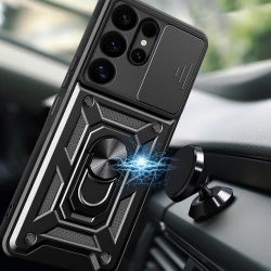 Etui pancerne Hybrid Armor Camshield z osłoną aparatu i metalowym ringiem do Samsung Galaxy S25 Ultra - czarneOdkryj Etui Pancerne Hybrid Armor Camshield – idealne rozwiązanie dla wszystkich, którzy chcą chronić swój Samsung Galaxy S25 Ultra w każdej sytuacji. To etui zapewnia doskonałą ochronę przed uszkodzeniami i zarysowaniami dzięki wzmocnionej konstrukcji. Zintegrowana osłona aparatu gwarantuje bezpieczeństwo soczewek, chroniąc je przed brudem i pęknięciami. Metalowy ring służy nie tylko jako wygodny uchwyt na palec, ale również jako praktyczna podstawka, która pozwoli Ci wygodnie oglądać filmy czy czytać teksty na ekranie. Perfekcyjnie dopasowane wycięcia zapewniają pełen dostęp do wszystkich funkcji telefonu. Specyfikacja: