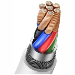 Przewód wykonano z elastycznej, odpornej na zużycie powłoki oraz wzmocniono newralgiczne miejsca przy wtykach, co skutecznie ogranicza ryzyko pęknięć podczas wielokrotnego zginania. Miedziane przewodniki i wielowarstwowe ekranowanie dbają o stabilny przepływ prądu na całej długości 3 m oraz o czysty sygnał danych, nawet w otoczeniu pełnym zakłóceń. Końcówki są precyzyjnie spasowane, więc wtyk USB-C pewnie siedzi w porcie i nie wypada przy przypadkowym pociągnięciu.
