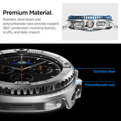 Spigen Bezel Tune Pro Pilot to wysokiej jakości nakładka zaprojektowana z myślą o użytkownikach ceniących styl, ochronę i precyzję wykonania. Wykonana z premium stali nierdzewnej oraz wytrzymałego tworzywa PC, gwarantuje długotrwałą trwałość i odporność na codzienne zużycie. Charakterystyczny design nadaje zegarkowi klasyczny, a zarazem wyrafinowany wygląd, idealnie wpisując się w elegancki i nowoczesny styl. Zestaw składa się z eleganckiej, szczelnie dopasowanej poliwęglanowej obudowy oraz stalowego pierścienia, które razem chronią zegarek przed zarysowaniami, uderzeniami i innymi uszkodzeniami mechanicznymi. To połączenie nie tylko zabezpiecza, ale też podkreśla charakter urządzenia, nadając mu wyjątkowy wygląd. CECHY PRODUKTU: ZESTAW ZAWIERA: