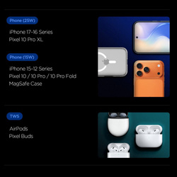 Spigen Essential EF302MOQ Qi2.2 to innowacyjna, kompaktowa stacja ładująca zaprojektowana z myślą o maksymalnej wygodzie i wydajności. Urządzenie wspiera najnowszy standard Qi 2.2, oferując szybkie ładowanie bezprzewodowe do 25W dla smartfonów i do 5W dla słuchawek bezprzewodowych, takich jak AirPods czy Pixel Buds, umożliwiając jednoczesne zasilanie dwóch urządzeń w jednym miejscu. Dzięki magnetycznemu systemowi MagSafe ładowarka stabilnie utrzymuje smartfony w idealnym położeniu, zapewniając optymalne połączenie i pełną moc ładowania. Aktywne sterowanie temperaturą chroni urządzenia przed przegrzewaniem, a wbudowane funkcje Overcharge Prevention i FOD (Foreign Object Detection) dbają o bezpieczeństwo i długowieczność baterii, minimalizując ryzyko przeładowania lub zakłóceń spowodowanych obecnością metalowych przedmiotów. Dodatkowo stacja ładowania wyposażona jest w port USB-C 5W, który pozwala na zasilanie dodatkowego urządzenia przewodowo, co zwiększa funkcjonalność i daje więcej możliwości ładowania w tym samym czasie. Składa konstrukcja 2‑w‑1 umożliwia wygodne ładowanie zarówno smartfona, jak i dodatkowego akcesorium w tym samym czasie, co sprawia, że EF302MOQ idealnie sprawdzi się na biurku, w sypialni czy w podróży. Elegancki i kompaktowy design pozwala na dyskretne ustawienie urządzenia w dowolnym miejscu. Spigen EF302MOQ to idealne rozwiązanie dla osób, które chcą połączyć wygodę, bezpieczeństwo i wysoką wydajność w jednej, eleganckiej ładowarce bezprzewodowej z możliwością dodatkowego ładowania przewodowego. CECHY PRODUKTU: ZESTAW ZAWIERA: