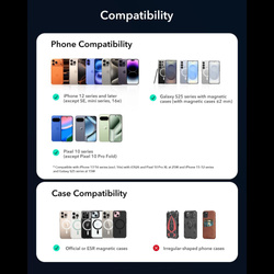 ESR OmniLock Qi2.2 to zaawansowany uchwyt samochodowy MagSafe z funkcją szybkiego ładowania 25 W, zaprojektowany z myślą o maksymalnej wygodzie i bezpieczeństwie podczas jazdy. Oficjalnie certyfikowana ładowarka bezprzewodowa Qi2.2, wyposażona w technologię CryoBoost, zapewnia stabilne, szybkie i bezpieczne ładowanie urządzeń kompatybilnych z MagSafe, jednocześnie aktywnie chłodząc telefon, aby utrzymać najwyższą wydajność. Udoskonalony zaczep montażowy oferuje wyjątkową stabilność dzięki zakrzywionej, amortyzującej silikonowej podkładce oraz mechanizmowi blokującemu, który chroni przed przesuwaniem i przewróceniem. Wzmocniony aluminiowy hak solidnie trzyma się większości otworów wentylacyjnych (do 32 mm), nie powodując ich uszkodzenia. Mocne magnesy N52 zapewniają pewne i precyzyjne utrzymanie telefonu nawet na najbardziej wyboistych trasach — dla najlepszych efektów zaleca się korzystanie z oficjalnych etui MagSafe lub etui magnetycznych ESR. Uchwyt oferuje pełną swobodę regulacji, dzięki ramieniu obracanemu o 360° oraz przegubowi kulowemu z możliwością nachylenia o 60° w każdą stronę, co pozwala ustawić idealny kąt widzenia bez użycia rąk. Konstrukcja ze wzmocnionego stopu aluminium zapobiega wyginaniu i luzowaniu się elementów, gwarantując długotrwałą stabilność również na nierównych drogach. CECHY PRODUKTU: ZESTAW ZAWIERA: