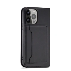 Etui iPhone 14 z serii Magnet Card Case pokrowiec z klapką z funkcją portfela i podstawki w kolorze czarnym Etui Magnet Card Case dopasowane do iPhone 14, doskonale chroni telefon przed zniszczeniami wskutek upadków lub zarysowań (na przykład przez noszone w kieszeni klucze). Podniesione krawędzie dookoła ekranu i tylnego aparatu zabezpieczają telefon od zarysowania tych elementów kiedy ten leży na płaskiej powierzchni. Posiada responsywne przyciski i wycięcia na porty. Idealny dla osób, które cenią sobie styl, jakość i chcą zadbać o swoje urządzenie. Pełni wiele funkcji: zabezpieczy Twojego iPhone 14 przed przypadkowym uszkodzeniem, przechowa najpotrzebniejsze karty czy banknoty, zmieni się w podstawkę do wygodnego oglądania filmów. Łączy w sobie etui, portfel i ochronę. Specyfikacja: