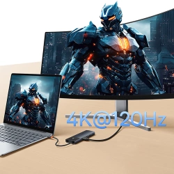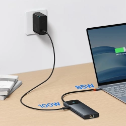 Obsługa 4K@120Hz na HDMI1 zachwyca jakościąPort HDMI1 w hubie Baseus Metal Gleam II obsługuje obraz 4K przy 120Hz, co oznacza niezwykle płynne i ostre odwzorowanie detali – idealne dla graczy, grafików i profesjonalistów pracujących z multimediami. Szybki transfer danych przez USB 3.2 Gen 2Dwa porty o przepustowości do 10Gbps umożliwiają przesyłanie dużych plików (np. 20 GB w zaledwie 20 sekund), co przekłada się na oszczędność czasu i wydajność pracy. PD 100W – szybkie ładowanie laptopaPort wejściowy USB-C obsługuje Power Delivery do 100W, zapewniając ładowanie laptopa z mocą do 85W bez przerywania pracy z innymi urządzeniami. Tryby rozszerzeń na Windows i MacOSHub umożliwia pracę w różnych konfiguracjach: rozszerzenie obrazu na dodatkowe dwa monitory, odbicie lustrzane lub różne treści na każdym ekranie – zależnie od systemu. Przycisk blokady ukrywa ekran natychmiastWbudowany przycisk umożliwia błyskawiczne wygaszenie wyświetlanego obrazu – szczególnie przydatne w sytuacjach, gdy chcesz zachować poufność treści na ekranie.
