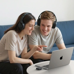 Bluetooth 5.4 – stabilne połączenie bez zakłóceńNajnowszy standard Bluetooth 5.4 gwarantuje szybkie parowanie, niskie opóźnienia i stabilny sygnał nawet w otoczeniu wielu urządzeń bezprzewodowych. Dźwięk jest czysty i zsynchronizowany z obrazem, co zapewnia komfortowe oglądanie filmów i granie. Podwójne gniazdo 3,5 mm – idealne do samolotuDwa wtyki 3,5 mm umożliwiają podłączenie transmitera do systemów audio w samolotach, laptopach czy telewizorach, eliminując potrzebę używania kabli słuchawkowych. Idealne rozwiązanie do podróży i codziennego użytku. Łączność z dwiema słuchawkami jednocześnieUgreen BT305 umożliwia połączenie dwóch zestawów słuchawek Bluetooth, co pozwala dwóm osobom słuchać tego samego źródła dźwięku – świetne rozwiązanie dla par lub rodzin w podróży. 19 godzin nieprzerwanego działaniaWbudowany akumulator pozwala na nawet 19 godzin ciągłej pracy, a szybkie ładowanie przez USB-C umożliwia ponowne korzystanie z urządzenia w krótkim czasie. Intuicyjna obsługa i wskaźniki LEDDedykowane przyciski dla każdego urządzenia Bluetooth oraz diody LED pozwalają łatwo kontrolować stan połączenia i poziom baterii. Obsługa transmitera jest prosta i wygodna nawet podczas podróży.