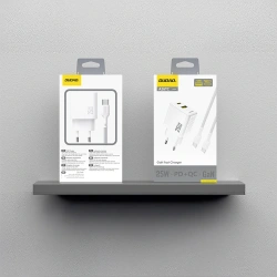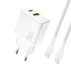 Ładowarka sieciowa Dudao A26TCEU PD QC 25 W GaN USB-A USB-C z kablem USB-C - białaŁadowarka sieciowa Dudao A26TCEU to nowoczesne i funkcjonalne rozwiązanie do szybkiego ładowania urządzeń mobilnych w domu, biurze i w podróży. Technologia GaN w połączeniu z mocą do 25 W zapewnia wysoką wydajność przy kompaktowych rozmiarach. Dwa porty - USB-C oraz USB-A - umożliwiają jednoczesne ładowanie dwóch urządzeń, a obsługa Power Delivery i Quick Charge skraca czas uzupełniania energii. Antypoślizgowa faktura obudowy zwiększa komfort i bezpieczeństwo użytkowania. W zestawie znajduje się kabel USB-C - USB-C, dzięki czemu ładowarka jest gotowa do użycia od razu po wyjęciu z opakowania. Specyfikacja: