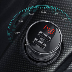 - Inteligentna ładowarka samochodowa z wyświetlaczem napięcia ładowania. Kompaktowy gadżet wyposażony w 2 porty USB o łącznym prądzie wyjściowym 24W/4,8A. Doskonały do naładowania akumulatorów mobilnych urządzeń takich jak smartfony czy tablety.