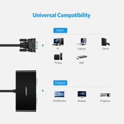 Imponująca kompatybilność Szeroka kompatybilność sprawia, że rozdzielacz UGREEN 40254 jest wyjątkowo uniwersalny. Jego złącze wejścia pasuje między innymi do komputerów, laptopów i konsol. Z kolei złącze wyjścia bez problemu podłączysz do projektora, monitora lub wyświetlacza.