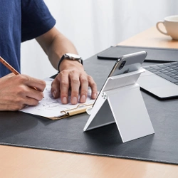Funkcjonalna i kompaktowaPodstawka jest wykonana z najwyższej jakości materiałów, ABS-u, który zabezpiecza produkt przed uszkodzeniem, i silikonowych nakładek chroniących telefon przez przesuwaniem i zarysowaniem. Dodatkowo, dzięki przemyślanej konstrukcji, podstawka zawiera otwór, dzięki czemu możesz z niej korzystać również podczas ładowania telefonu. Co więcej, stojak jest niewielki więc zabierzesz go ze sobą wszędzie.