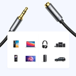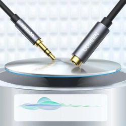 Przedłużacz marki Ugreen do kabla audio AUX 3,5 mm mini jack 3m Kabel audio, ze złączem żeńskim i męskim 3,5 mm mini jack, przedłużacz audio, który świetnie sprawdzi się do wydłużenia np. kabla słuchawkowego. Za jego pomocą masz możliwość wygodnego słuchania muzyki na swoich ulubionych słuchawkach, nawet kiedy twój telefon, tablet lub odtwarzacz muzyczny leży z dala od Ciebie. Wtyczki przewodu są wykonane z cynkowanej miedzi i pokryte 24 karatowym złotem. Taka konstrukcja gwarantuje, że dźwięk będzie pełny i nieskazitelny. Muzykę możesz odtwarzać z dowolnego urządzenia, wyposażonego w złącze 3,5 mm mini jack. Cały kabel jest wykonany z wysokiej jakości materiałów. Zapewnia mu to lepszą odporność na drobne uszkodzenia, złamania i zerwania. Możesz dzięki niemu słuchać muzyki będą w dalszej odległości np. od komputera lub telefonu.